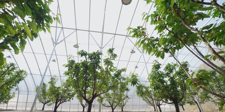 园区里的另一“宝”则是精选国内外优质品种的樱桃树。目前,整个园区建有150个高标准智能化樱桃种植大棚。棚内,用腐殖土培植的一棵棵樱桃树排列整齐,有些樱桃树还实现了灯照,提升农产品生产的现代化水平。张玉兵介绍,在这里,樱桃树什么时候休眠,什么时候开花结果,可以做到“令行禁止”。因为大棚采用了国内领先的3层保温技术和精准控温系统,实现人工错峰制造四季变换,实现樱桃树9—10月休眠,2—4月上市,填补了国内樱桃市场空白期。
