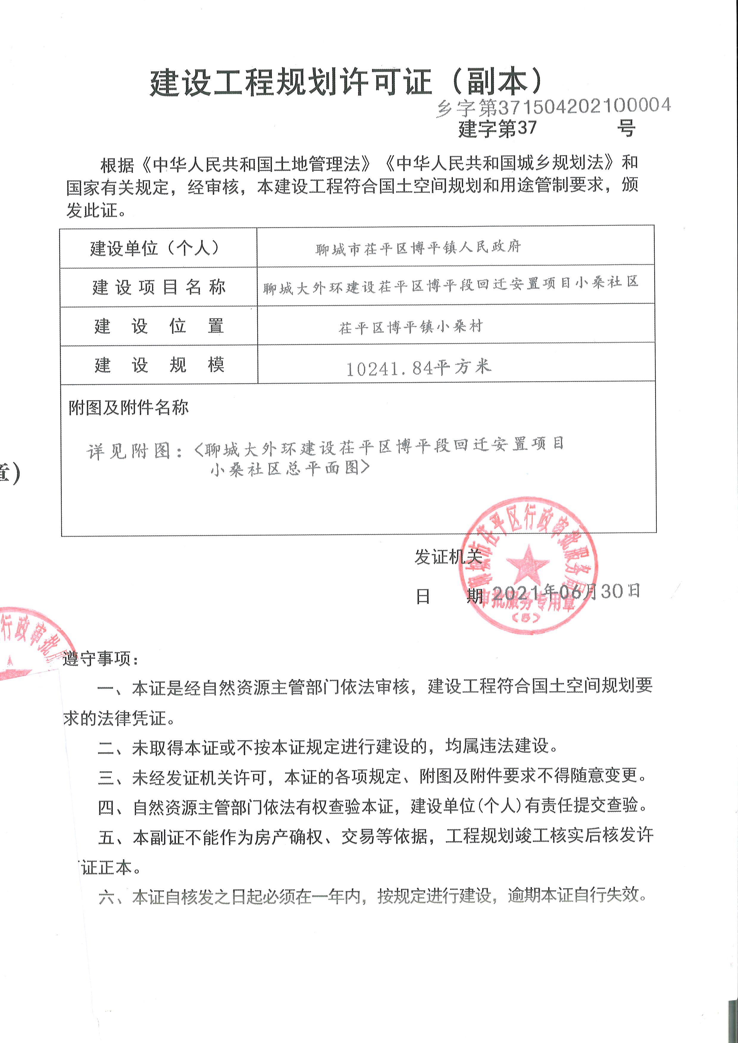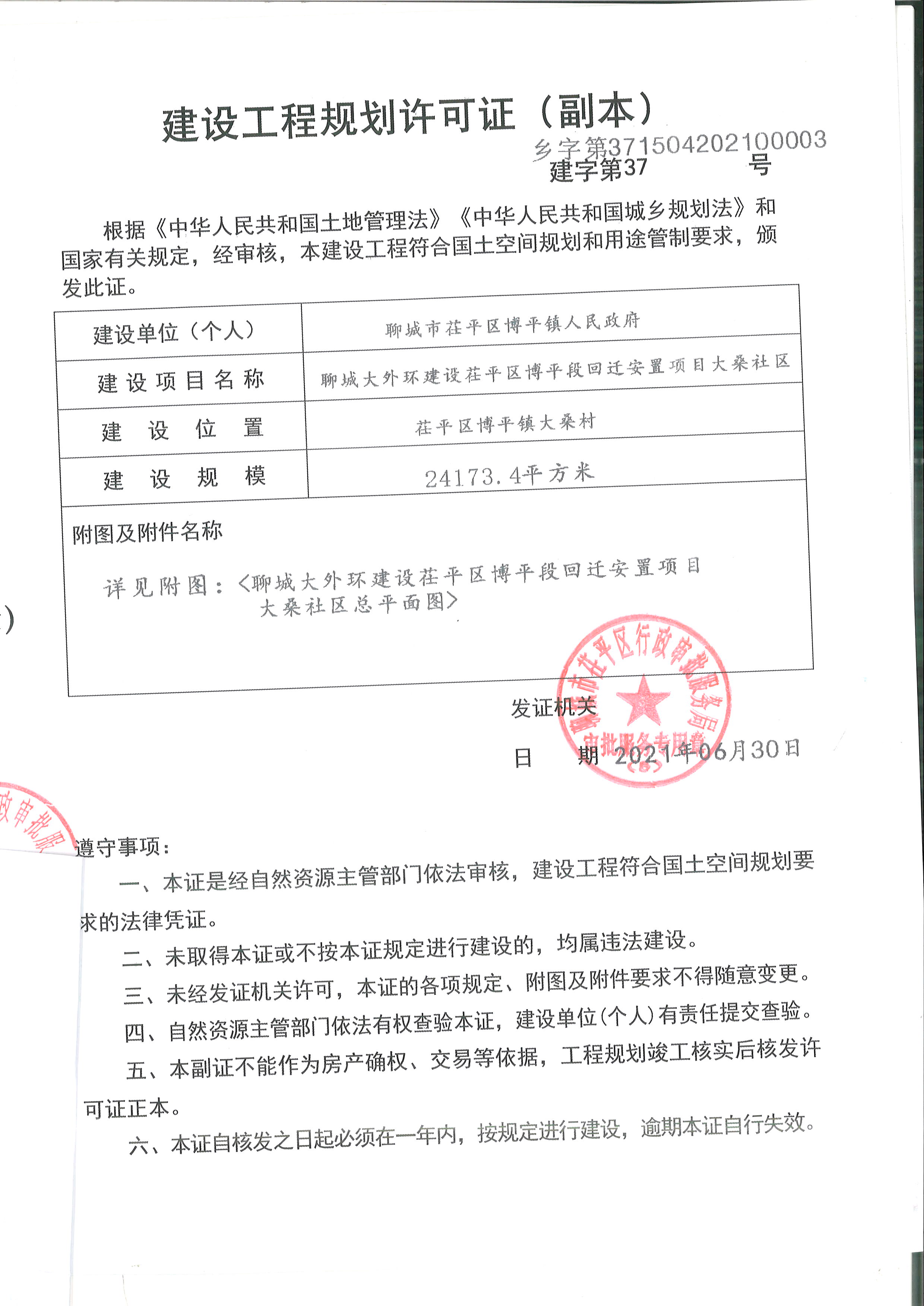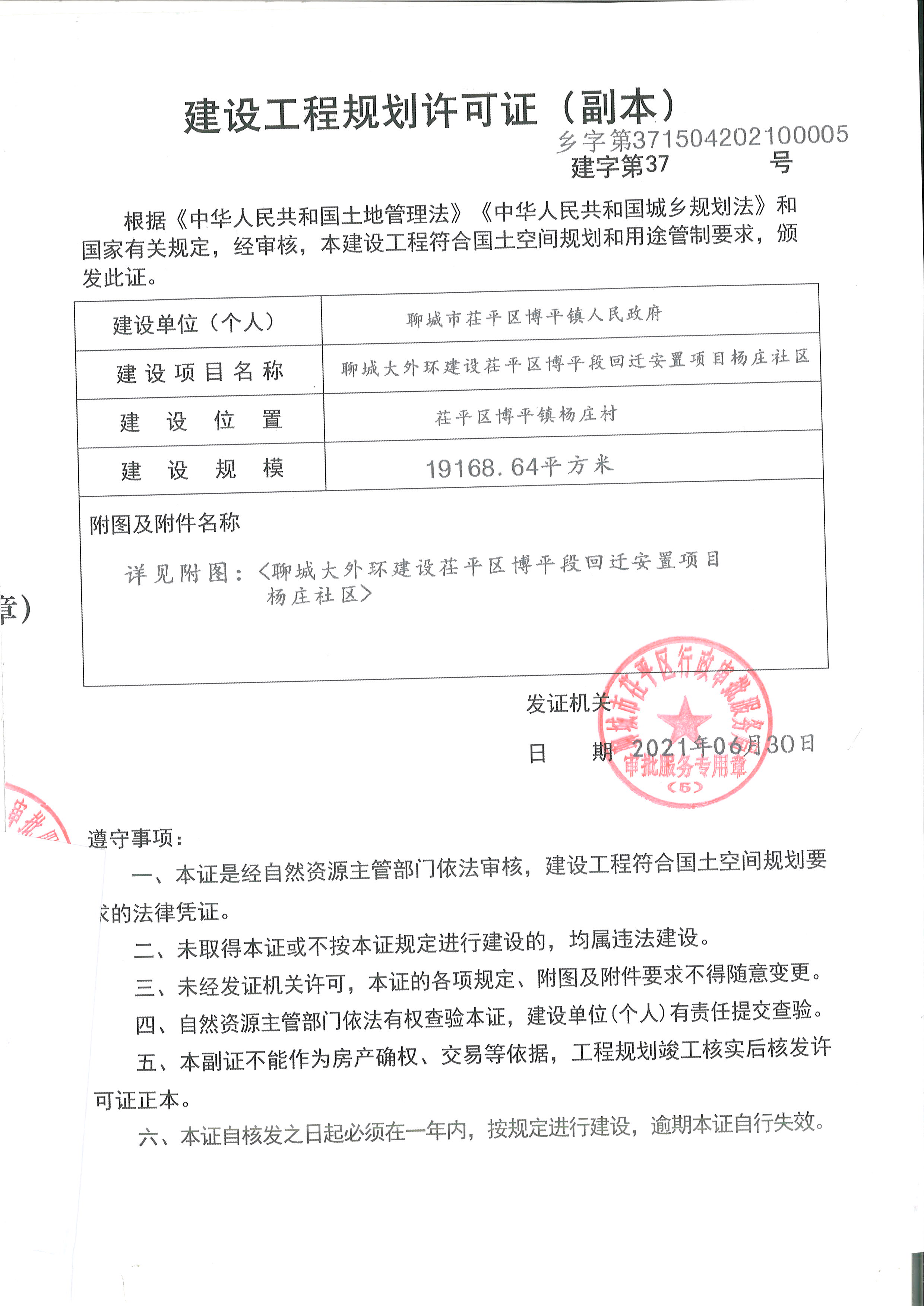 聊城大外环建设茌平区博平段回迁安置项目规划许可审批结果