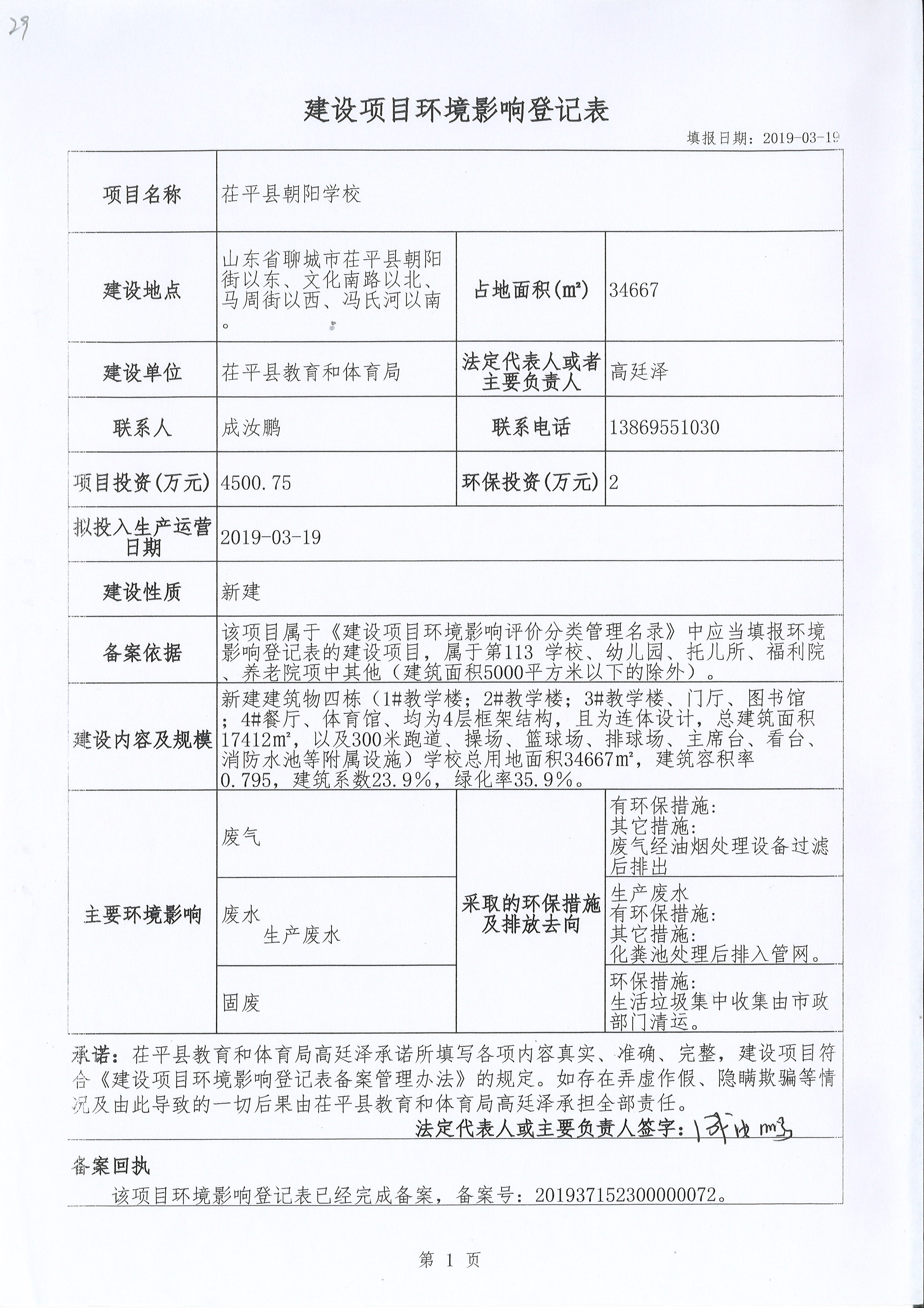 茌平区朝阳街学校环境影响登记表