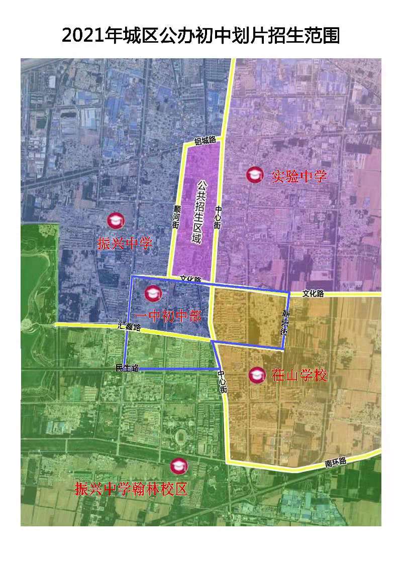 一中初中部:一年级暂在朝阳小学学习,待高中部搬入信发高中后回现一中校址就读。中心街以西,枣乡街以东,民生路以北,文化路以南;中心街以东,文化路以南,汇鑫路以北,朝阳街以西。本片区可选择一中初中部,也可按原划片范围选择学校。