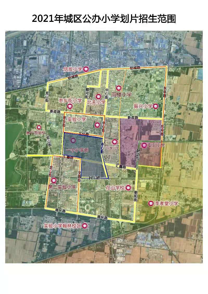 一中小学部:一年级暂在朝阳小学学习,待高中部搬入信发高中后回现一中校址就读。文化路以南,民生路以北,枣乡街以东,中心街以西,本片区可选择一中小学部,也可按原划片范围选择学校。