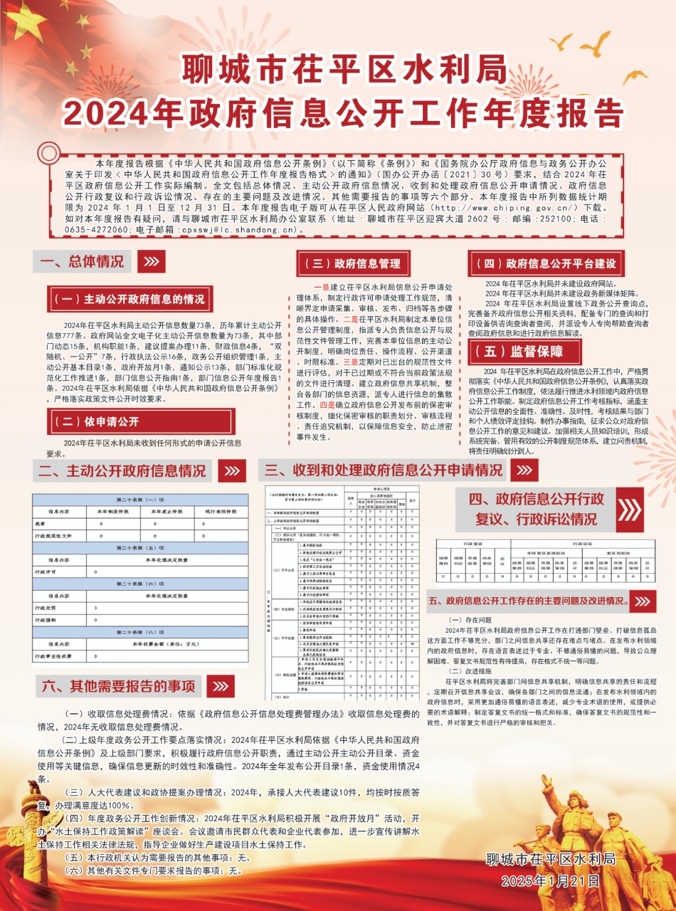 本年度报告根据《中华人民共和国政府信息公开条例》(以下简称《条例》)和《国务院办公厅政府信息与政务公开办公室关于印发<中华人民共和国政府信息公开工作年度报告格式>的通知》(国办公开办函〔2021〕30号)要求,结合2024年茌平区政府信息公开工作实际编制。全文包括总体情况、主动公开政府信息情况、收到和处理政府信息公开申请情况、政府信息公开行政复议和行政诉讼情况、存在的主要问题及改进情况、其他需要报告的事项等六个部分。本年度报告中所列数据统计期限为2024年1月1日至12月31日。本年度报告电子版可从茌平区人民政府网站(http://www.chiping.gov.cn/)下载。如对本年度报告有疑问,请与聊城市茌平区水利局办公室联系(地址:聊城市茌平区迎宾大道2602号;邮编:252100;电话:0635-4272060;电子邮箱:cpxswj@lc.shandong.cn)。