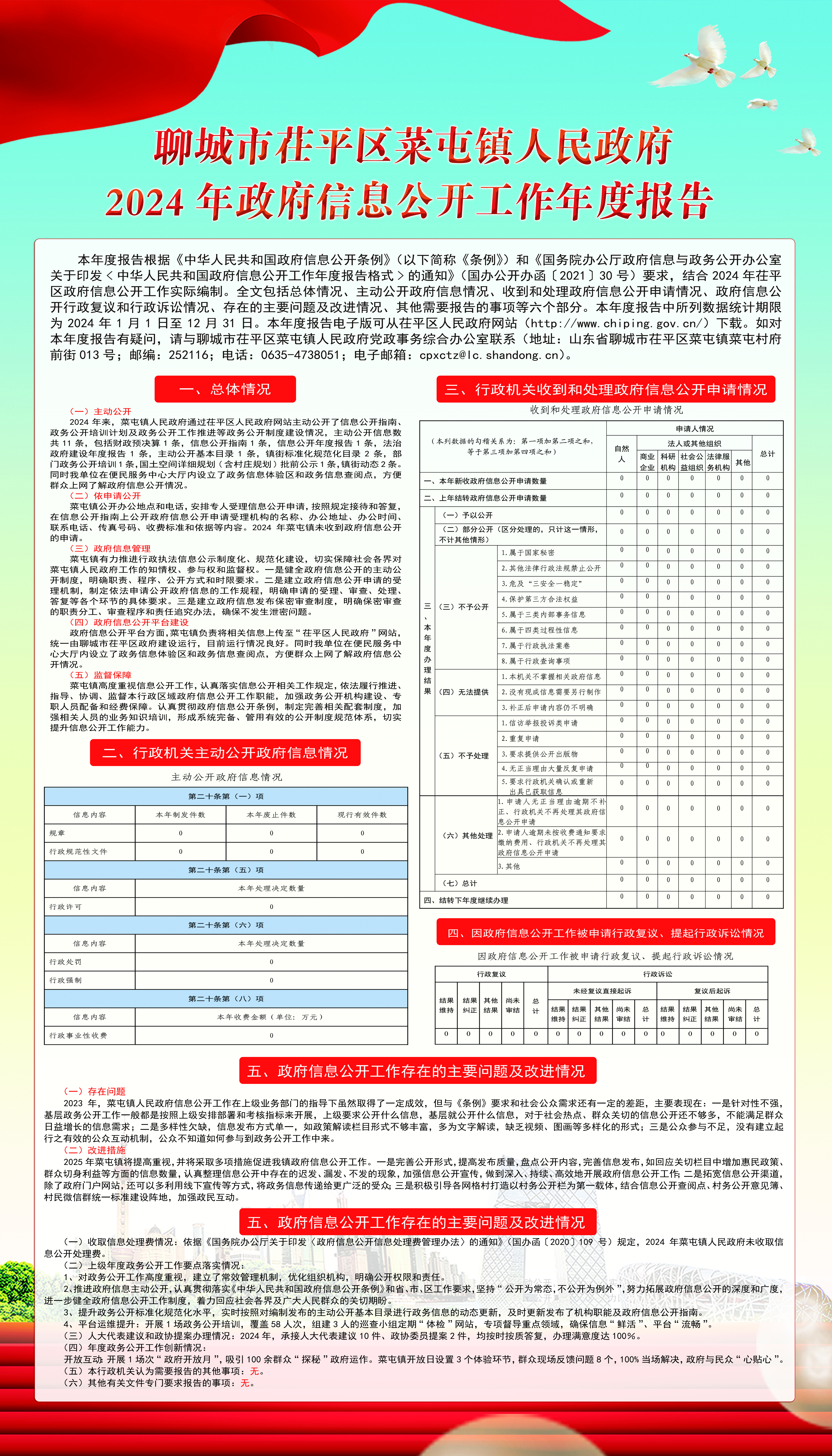 本年度报告根据《中华人民共和国政府信息公开条例》(以下简称《条例》)和《国务院办公厅政府信息与政务公开办公室关于印发<中华人民共和国政府信息公开工作年度报告格式>的通知》(国办公开办函〔2021〕30号)要求,结合2024年茌平区政府信息公开工作实际编制。全文包括总体情况、主动公开政府信息情况、收到和处理政府信息公开申请情况、政府信息公开行政复议和行政诉讼情况、存在的主要问题及改进情况、其他需要报告的事项等六个部分。本年度报告中所列数据统计期限为2024年1月1日至12月31日。本年度报告电子版可从茌平区人民政府网站(http://www.chiping.gov.cn/)下载。如对本年度报告有疑问,请与聊城市茌平区菜屯镇人民政府党政事务综合办公室联系(地址:山东省聊城市茌平区菜屯镇菜屯村府前街013号;邮编:252116;电话:0635-4738051;电子邮箱:cpxctz@lc.shandong.cn)。